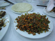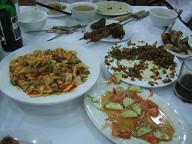 これは、奥に見えるパン生地に、 手前の料理をくるんで食べます。 ![]() 羊肉串(ヤンロウチュアン)です。 よく道端で売っていますが、それと同じやつです。 ![]() これは、野菜サラダですね。 意外と美味しかった。 ![]() 3人して美味しく食事ができました。 う〜む、満足じゃ。 お値段は、一人頭70元ぐらいだったと思います。 たくさん美味しく食べれて、この値段とは…。 かな〜りお得ですよね。