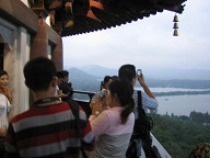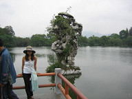 そして、再び船で移動します。 2つ目の島へと移動します。 ![]() 2つ目の島へと到着しました。 どうやら、この島には湖があるようですよ。 ![]() 湖の中には、こういった奇岩がいくつか置いてありました。 また、この湖は、上空から見ると「田」の字をしているそうです。 ![]() 島の中を観光中です。 島のあちこちで記念撮影をしている人がたくさんいましたよ。 ![]() 奇岩です。 ![]() 途中で、とある食べものを買いました。 ちょっと甘くてどろっとした食べものです。 ![]() こういう名前がついていました。 みんな食べていて、おいしそうに見えたのですが、 まぁ、たいして美味しくはなかったですね…。 1つ5元でした。 ![]() 近くでは、変装写真(?)を撮っている(撮らされている?) 子供がいましたよ。 ![]() また、オウムもいました…。 二匹とも結構大きかったです。 ![]() これが、この島の名前だと思います。 そして、この島を後にして、湖の南西の湖岸へと移動しました。