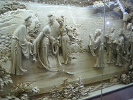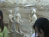 そして、花港観魚という場所を観光しました。 ここは、魚がたくさんいる所のようです。 魚もいましたが、途中、クジャクもいましたよ。 ![]() 花港観魚を見終わった後、最後の観光地である 雷峰塔へと向かいます。 ![]() 歩いて移動中です。 だいぶ近くまで来ましたね。 ここら辺で、切符を買うようです。 ![]() 切符を買って中に入ります。 ここは、2002年に建てられたようで、結構新しいです。 エスカレータもあります! なんとも歴史を感じさせない観光地ですねぇ。 動画はこちらからどうぞ。 ![]() エスカレータに乗って移動中です。 ラクチンでいいですね(笑)。 ![]() そして、塔の中に入りました。 どうやらここには、昔の塔の残骸が保存されているようです。 土の塊といった感じでした。 塔の土台近辺がかろうじて残っているようです。 ![]() 下のほうには、お金がたくさんありました。 みんなお金を投げ込んでいるようですね。 ![]() そして、塔へと登ることにします。 ![]() エレベータもありましたが、我々は階段で移動しました。 途中の回には、このような彫り物がありました。 白蛇伝説という物語がこの塔にはあるようですね。 なかなか面白い物語でしたよ。