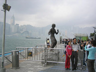 おや、これは、ジェットリーではないですか。 ![]() ちょっとアップで。 ![]() さらに歩いていたら、おお!、ありましたよ。 ブルースリーの銅像が! 近くでみたのですが、デカイ!! 写真からはちょっとわかりませんが、実物より かなりでっかく作ってあると思われます。 ![]() アップで! ![]() もうちょい正面から。 ![]() ちょいカメラを引きました。 後ろには香港島も映っていて、 なかなか良い感じですね。 ![]() さらに、カメラを引いてみました。 たくさんの人たちが、ここで記念写真を撮っていましたね。 ![]() こんな感じでね。 ![]() 周りは、こんな感じです。 ![]() おや、チャウシンチーの名前を発見。 「周星馳」ですね。 しかし、これまた、残念ながら手形がありません…。 ![]() 途中には、このように映画撮影の様子を表した 銅像がいくつかありましたね。 ![]() ここからさらに東の方はこんな感じです。 ![]() スター通りが終わりました。 その先には、このように釣りをしている人がいましたね。 ![]() シャングリラホテルがありました。 シャングリラは、上海にもありますね。 浦東の東方明珠の近くにあります。 さて、ここから戻って、スターフェリーに乗って、 香港島へ移動することにします。 ![]() 来た道をそのまま戻るのではなくて、 道路の方を歩いて戻ることにしました。 「New world Centre」という文字が見えてきました。 これは、口座開設本にも書いてあったと思いますね。