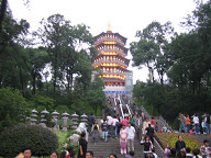 そして、花港観魚という場所を観光しました。 ここは、魚がたくさんいる所のようです。 魚もいましたが、途中、クジャクもいましたよ。 ![]() 花港観魚を見終わった後、最後の観光地である 雷峰塔へと向かいます。 ![]() 歩いて移動中です。 だいぶ近くまで来ましたね。 ここら辺で、切符を買うようです。 ![]() 切符を買って中に入ります。 ここは、2002年に建てられたようで、結構新しいです。 エスカレータもあります! なんとも歴史を感じさせない観光地ですねぇ。 動画はこちらからどうぞ。 ![]() エスカレータに乗って移動中です。 ラクチンでいいですね(笑)。 ![]() そして、塔の中に入りました。 どうやらここには、昔の塔の残骸が保存されているようです。 土の塊といった感じでした。 塔の土台近辺がかろうじて残っているようです。 ![]() 下のほうには、お金がたくさんありました。 みんなお金を投げ込んでいるようですね。 ![]() そして、塔へと登ることにします。 ![]() エレベータもありましたが、我々は階段で移動しました。 途中の回には、このような彫り物がありました。 白蛇伝説という物語がこの塔にはあるようですね。 なかなか面白い物語でしたよ。