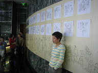 今日は、国慶節の初日です。 今日は ・金茂ビル ・水族館 ・外灘の観光船 のこの3つに行ってみることにしました。 まずは、金茂ビルです。 ここは、アジアで最も高くて世界では第三位の高さを誇るビルです。 高さは450メートルです。 ![]() 金茂ビルに到着です。 金茂ビルは、浦東にあります。 東方明珠TV塔のすぐ近くです。 私は、地下鉄に乗って30分ちょいで、最寄の駅に到着しました。 そこから歩いて5分ほどでしょうか、金茂ビルに到着しました。 今日は、国慶節の初日ですから、結構人が多いことが予想されます。 時間は午前11:30過ぎです。 今日の天気は曇りで、後ほど少し雨が降ってきましたね。 外は少し肌寒かったです。 国慶節を祝う赤い風船があちこちに見られましたね。 ![]() これは、ビルの下の方です。 早速入り口から入ります。 ![]() 地下一階に降りました。 ここで、切符を買うようです。 大人1人50元でした。 ![]() 切符を係りの人が改札に通して、エレベータを待つエリアへと入ります。 さすがに東方明珠より人はだいぶ少なさそうですね。 国慶節だからもっと多いと思っていましたが。 ![]() エレベータにのって、あっという間に最上階の88階に到着しました。 ほんとに、あっという間でしたね。 1,2分ぐらいでしょうか。 東方明珠は、最上階までいくのに待ち時間がかなり長いのですが、 こちらはあっという間なので、なにげに良いかもしれません。 ![]() 外を見ます。 あいやー、曇っているので近くしか見えませんねぇ。 ![]() 部屋の中を見回すと、願い事を掲げる木がありました。 家庭の幸せなどのお願いがしてありましたね。 ![]() 東方明珠と正大広場を見たところです。 奥は外灘ですね。 ![]() 再び中を見回すと、空中郵便局といって、 郵便局がありました。 絵葉書や北京オリンピック記念切手などが売ってありましたよ。 ![]() おや、これは、トムソンの億ションではないですか? さすがのトムソンの億ションも、小さく見えますね。 ![]() 部屋の中央まで行ってみると…。 なんと、下のフロアが見えるではないですか? このフロアは55階だったかな? 見ていると吸い込まれそうです…。 足の感覚がヘンになってきましたよ。 ちょっと恐いので、この辺にしておきます。 ![]() 再び外を見ていると、建築中の高層ビルが見えました。 デカイクレーンが見えますね。 ここら付近は、いたるところで工事が行われていましたね。 もっとたくさんの建物やビルができるようですね。 ![]() 金茂ビルの外観は、こんな感じです。 アメリカや日本、ホンコン、上海の会社が このビルのデザインを行って、最終的に アメリカのデザインに決まったようです。 また、ここの土地は柔らかいので、地面をかなり深くほって 基礎工事をやったと書いてありました。 比較的台風も多いので、台風や地震にもきちんと対処できる 強度が設計されている、とも書いてありましたね。 マグニチュード7の地震がきても、大丈夫みたいでしたよ。 ![]() さらに歩いていると、おじさんの写真がありました。 ![]() このおじさんは、絵描きさんのようで、上海の昔の人々の 様子を書いたりしているようですね。 このカベ一体に昔の上海の人々の生活を描いた絵が、 ずらっと書いてありましたよ。 ![]() 高層ビルの近くには、だいぶ昔に立てたマンション郡が見えます。 #写真中央から奥にかけてがそうです おそらく、こういった古めかしいマンション群も、そのうち再開発される のではないでしょうか。 高層ビルと古めかしいマンションが対象的ですね。 今の上海を象徴している図ではないでしょうか。