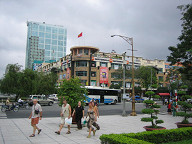 今日は、ホーチミン市内のデパートや観光名所を巡りたいと思います。 ![]() ホテルの部屋の窓から朝の様子を眺めてみました。 やっぱり、まださほど発展してない気がしますね。 ![]() アメニティです。 シャンプー、リンスはあるのですが、 ハブラシやハミガキ粉がないのですよね。 これには、ちょっと困りました。 ![]() その代わりにか、このような綿や糸が置いてありました…。 こんなの置いてあってもなぁ。 ![]() 朝食です。 パンが美味しいです。 豆も美味しかったです。 ![]() 今朝もフォーを食べます。 ベトナム人は朝ご飯でフォーを食べるらしいですからね。 ![]() 朝食もとったことだし、早速外出することにします。 ホテルを後にします。 ![]() ますは、近くにある本屋さんを覗いてみることにしました。 入り口に入ってすぐには、TOEICやTOEFLなどの英語学習に 関する本がたくさん置いてありましたね。 ベトナムでは英語学習は盛んなのでしょうかね。 PCの技術書を見ましたが、結構な値段がしました。 日本円で2、3千円ぐらいはしたかもしれません。 所得を考えると、技術書はかなり高い買い物ではなかろうか。 ![]() この書店は、4階まであったと思います。 2、3階あたりには、文房具やオモチャもありましたね。 4階はこのような子供の学習所といったところでしょうか。 3階までを見る限り、日本の書店の構成とだいぶ似ている感じでしたよ。 本屋と文房具やが一緒になっているところとかがね。 ![]() 一通り見終わったので、そとに出ました。 そしたら、ワッフルを焼いているおばちゃんがいました。 ![]() とりあえず、東へ歩いて行きます。 サイゴン川を見てみることにします。 途中、工事中の個所がありました。 他にも、ちらほらと工事中の個所がありましたね。 でも、上海ほどには再開発は頻繁ではなさそうですが。 ![]() 移動中です。 これは、お土産屋さんかな。 ![]() 道端には、果物を売る人たちがたくさんいましたね。 ![]() 日立のショベルカーです。 ![]() おや、水が置いてありますね。 このボトルは、中国と一緒ですね。 ![]() ホテルかな。 ![]() ダクストンホテルから東へと移動します。 ![]() フィルム写真の現像屋さんです。 多いですね。 ![]() おや、Panasonicの広告が見えました。 ![]() 大きな道路に出くわしました。 ここを渡るとサイゴン川になるようですね。 渡ろうとしていたら、たくさんのバイクタクシーや シクロが声をかけてきました。 ![]() 交通量が多いのでなかなか渡れなかったのですが、 ようやく渡ることができました。 渡った先は、ちょっとした公園みたいになっていましたね。 サイゴン川沿いの公園といった感じでしょうか。 ![]() サイゴン川です。 茶色ですね。 ![]() サイゴン川はこんな感じです。 ![]() 向かい側には、SANYOの看板がありました。 ![]() 北へ少し歩いていきたいと思います。 緑が多いですね。 ![]() 移動しようとしたら雨が降ってきました。 傘を持っていないので、ここでしばらく動けなくなってしまいましたね。 早く傘を手に入れなければ。 ![]() 今いる所はお店です。 後ろを振り返ってみたら、ペプシの広告がありました。 立っていたら、2,3人ぐらいの売り子が現れましたね。 サンダルやお土産品などを売ってました。 また、バイクタクシーも何人かが声をかけてきましたね。 スキあらば声をかけてくるようです。 ![]() サイゴン川には、貨物船が往来していました。 ![]() お店の少年が網を手に持って川を見ていますね。 魚が取れるのかな? ![]() 雨脚が弱くなったので、移動することにしました。 マジェスティックホテルがあります。 最初、ここも検討していたのですが、部屋がなかったので、 ダクストンホテルになりましたね。 ![]() マジェスティックホテルです。 ![]() 少し北へ歩いた所に、川の向こう岸に渡るフェリー乗り場がありました。 たくさんのバイクがここから入っていってました。 ![]() これが、フェリーのようです。 ![]() さらに少し北に歩きました。 これは、ルネッサンス・リバーサイドホテルです。 ![]() メリン広場が見えます。 ![]() ここには、チャン・フン・ダオ像というのがあります。 ![]() 天気がかなり怪しいです。 まだ、ホーチミンは雨季ですからね。 5〜11月が雨季だそうです。 ![]() 道路をようやく渡りました。 右側のビルは、メリン・ポイントタワーかな。 ![]() 自動販売機がありました。